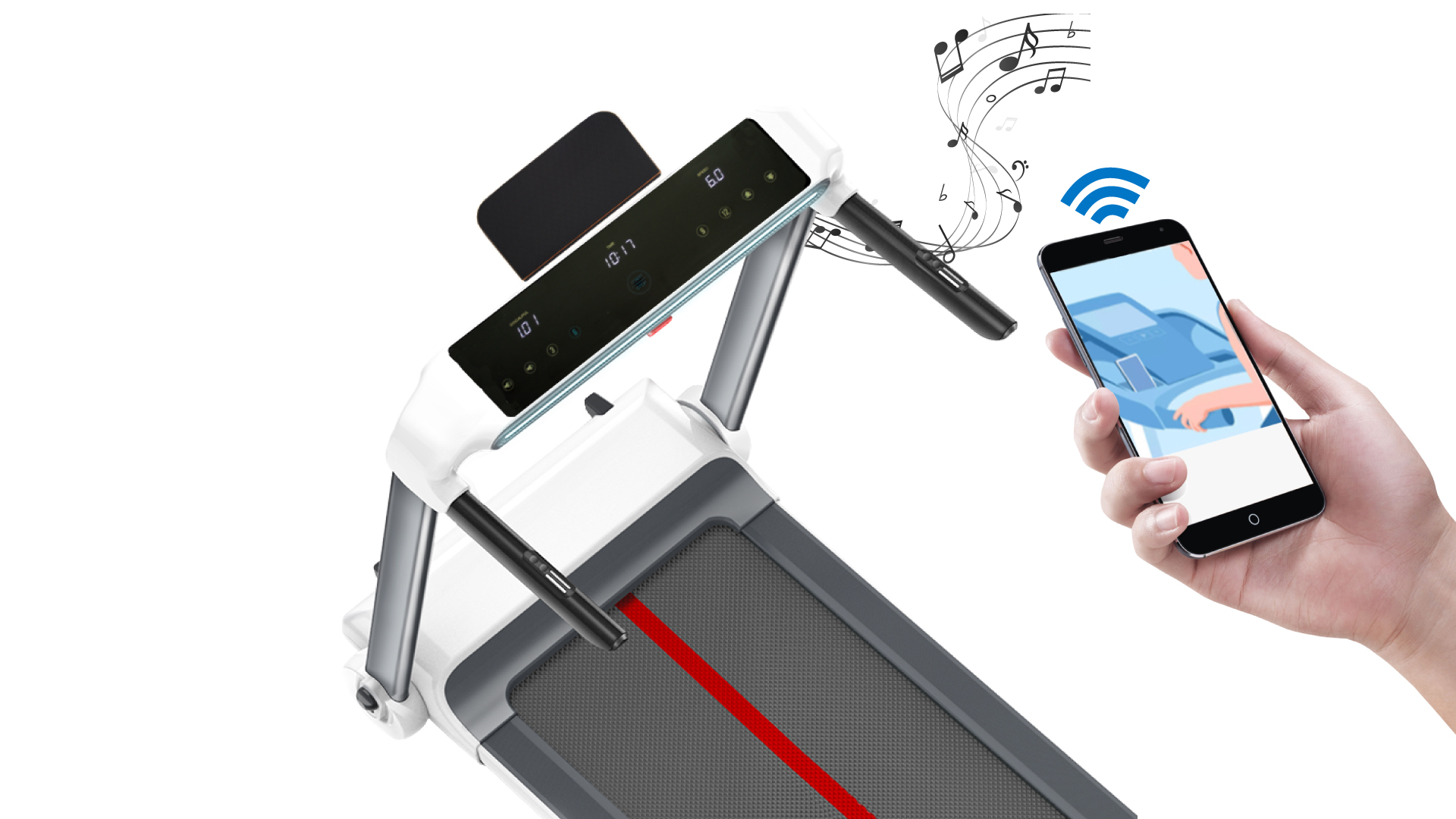 Ρυθμίστε την ταχύτητα με τα πλήκτρα άμεσης αλλαγής, μετρήστε το επίπεδο του καρδιακού παλμού σας μέσω των ειδικού αισθητήρων στις χειρολαβές και τοποθετήστε το tablet σας στην ειδική βάση για να κάνετε την προπόνηση πιο διασκεδαστική.
