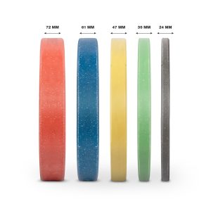 Σε σχέση με τους κλασικούς bumper plates, οι Slim έχουν μικρότερο πάχος χάρη στον μεταλλικό πυρήνα, επιτρέποντας φόρτωση περισσότερων κιλών στη μπάρα χωρίς αύξηση του όγκου.