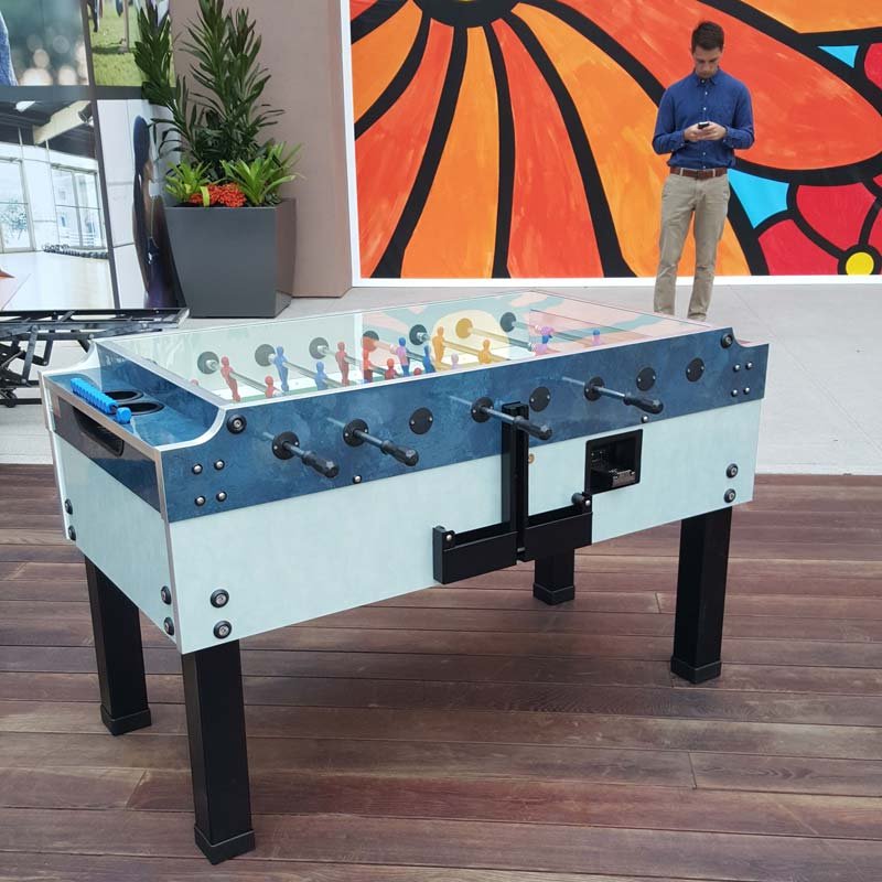 Το Olympic Outdoor, η εκδοχή του Deluxe Outdoor με γυάλινο κάλυμμα, κατασκευάζεται εξ’ ολοκλήρου από αδιάβροχα υλικά και εξαρτήματα: καμπίνα από κόντρα πλακέ θαλάσσης, αδιάβροχες κόλλες και λεπτομέρειες από ανοξείδωτο χάλυβα με ειδική επεξεργασία για αντοχή στη σκουριά. Κατάλληλο για παραλίες και υπαίθριες παιδικές χαρές, χώρους κάμπινγκ και πισίνες, είναι ιδανικό εκεί όπου δεν θα μπορεί να επιτηρείται πλήρως. Το γυάλινο κάλυμμα που σφραγίζει το χώρο παιχνιδιού αποτρέπει κάθε είδους αλλοίωση του παιχνιδιού, κάνοντας αδύνατη τη σκόπιμη παράτασή του. Έτσι, το τραπέζι αυτό εγγυάται τη μέγιστη κερδοφορία του επιχειρηματία που θα μπορεί να εκμεταλλεύεται πλήρως τον αυξημένο αριθμό που επισκέπτονται τα τουριστικά θέρετρα και τους χώρους διασκέδασης. Υπάρχει δυνατότητα απενεργοποίησης του μηχανισμου για δωρεάν παιχνίδι Η πολύ έξυπνη επίστρωση με αποχρώσεις που εναλλάσσονται μεταξύ σκούρου και ανοιχτού μπλε, μπορούν να προστατευτούν από τη δράση του ήλιου χρησιμοποιώντας ένα αδιάβροχο κάλυμμα. Τα κομψά πόδια από σφυρήλατο σίδηρο – με το λογότυπο Garlando – επιτρέπουν τη υψηλότερη σταθερότητα σε κάθε έδαφος. Το τραπέζι διατίθεται μόνο με πλήρως περιστρεφόμενο τερματοφύλακα.
