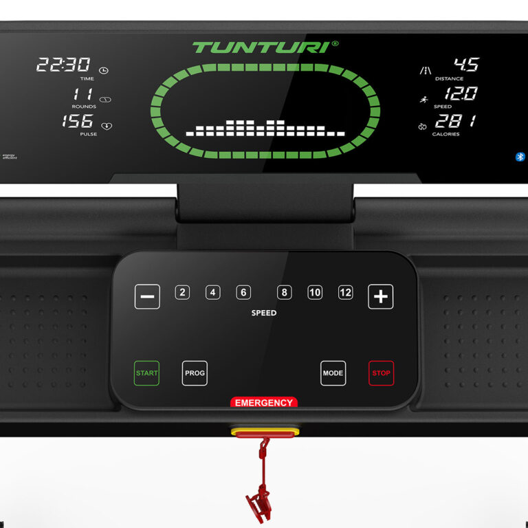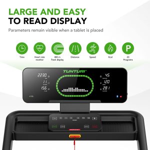 Ο διάδρομος γυμναστικής Tunturi Cardio Fit T30 διαθέτει μια γενναιόδωρη επιφάνεια τρεξίματος 120 × 43 cm. Αυτό σας δίνει περισσότερο από αρκετό χώρο για να περπατήσετε ή να τρέξετε άνετα. Η ταχύτητα είναι ρυθμιζόμενη από 0,8 έως 14 km/h και χάρη στα πλήκτρα συντόμευσης μπορείτε να τη ρυθμίσετε εύκολα. Η κλίση ρυθμίζεται χειροκίνητα σε 3 επίπεδα για επιπλέον ποικιλία. Επιλέξτε από 23 ενσωματωμένα προγράμματα προπόνησης για κάθε στόχο.