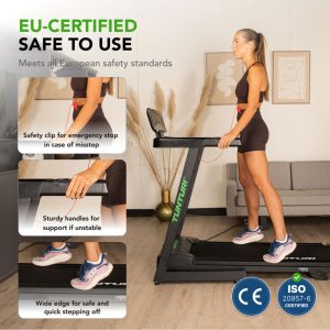 Ο διάδρομος γυμναστικής Tunturi Cardio Fit T30 είναι σχεδόν έτοιμος για χρήση κατευθείαν από το κουτί του. Μπορεί να ρυθμιστεί με τέσσερα απλά βήματα: τοποθετήστε το πλαίσιο σε όρθια θέση, ασφαλίστε το, βιδώστε τις λαβές και ρυθμίστε την οθόνη στην επιθυμητή θέση. Τα υποβραχιόνια και τα πλαϊνά στηρίγματα για τα πόδια παρέχουν πρόσθετη ασφάλεια. Η διακοπή έκτακτης ανάγκης με κλιπ ασφαλείας σταματά αυτόματα τον διάδρομο σε περίπτωση λάθους. Ο διάδρομος είναι κατάλληλος για χρήστες έως 120 κιλά και πιστοποιημένος κατά ISO 20957-6.